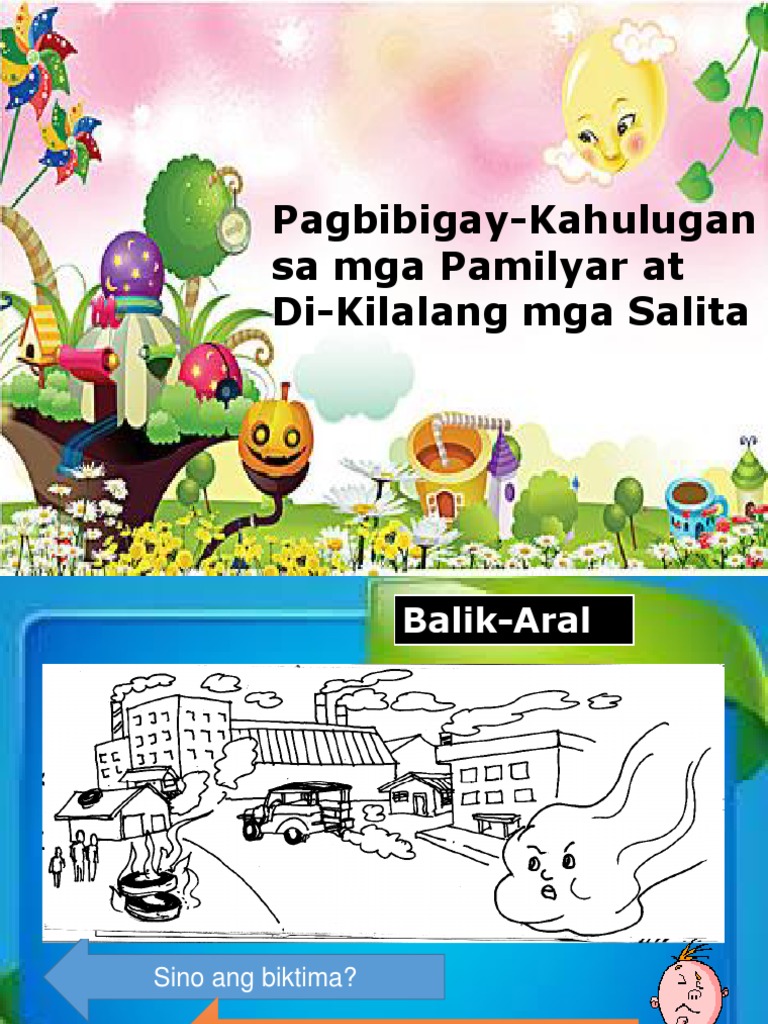 Magandang araw mga bata ako nga pala si maam Leolyn ng sampaguita village elementary school guro sa ika-apat na baitang na muling magbabahagi ng kaalaman sa asignaturang Filipino samahan nyo ako upang talakayin ang ating bagong aralin pagkatapos ng araling ito ang mga mag-aaral ay inaasahang makapagbigay ng kahulugan ng mga salitang pamilyar at di pamilyar sa pamamagitan ng pag. Pamilyar at di pamilyar na salita by millie1lagonilla.