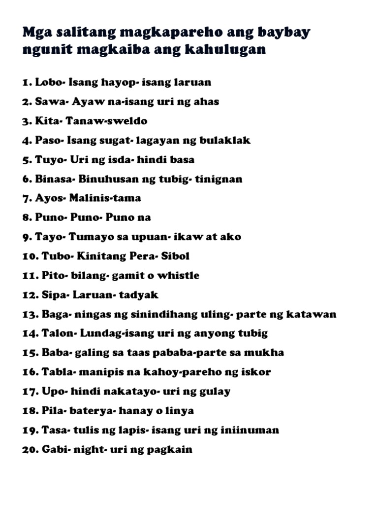 Sawa-ayaw na -isang uri ng ahas 3Pino- isang uri ng puno - maliit na maliit 4Pila- baterya - nanay 5Kita- tanaw - sweldo 6Paso- luma na - lalagyan ng halaman 7Pako- isang uri ng halaman - gamit ng karpintero 8Sulat- liham - pagsasatitik ng iniisip 9tuyo- isang uri ng. To downloadprint click on pop-out icon or print icon to worksheet to print or download. MGA SALITANG MAGKAPAREHO ANG BAYBAY NGUNIT MAGKAIBA ANG KAHULUGAN 1Lobo-isang uri ng laruan -isang uri ng hayop 2Sawa -ayaw na -isang uri ng ahas 3Pino- isang uri ng puno - maliit na maliit 4Pila- baterya - nanay 5Kita- tanaw - sweldo 6Paso- luma na - lalagyan ng halaman 7Pako- isang uri ng halaman - gamit ng karpintero 8Sulat- liham.